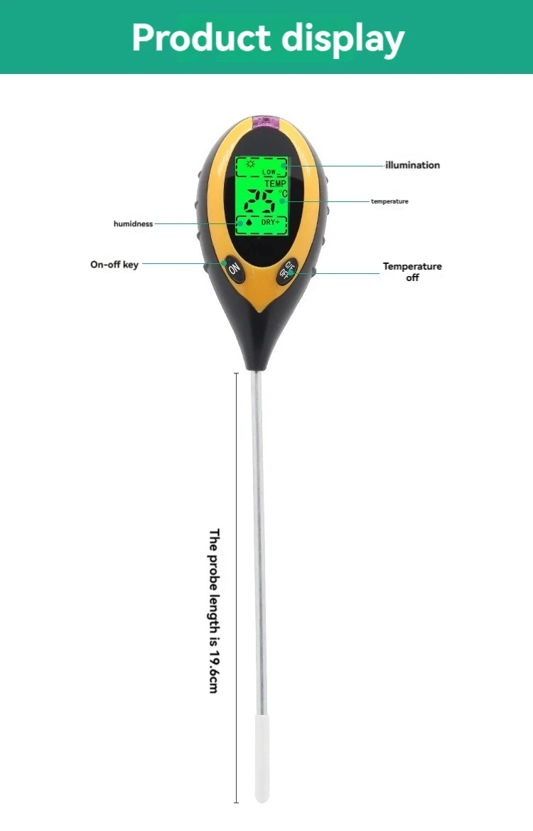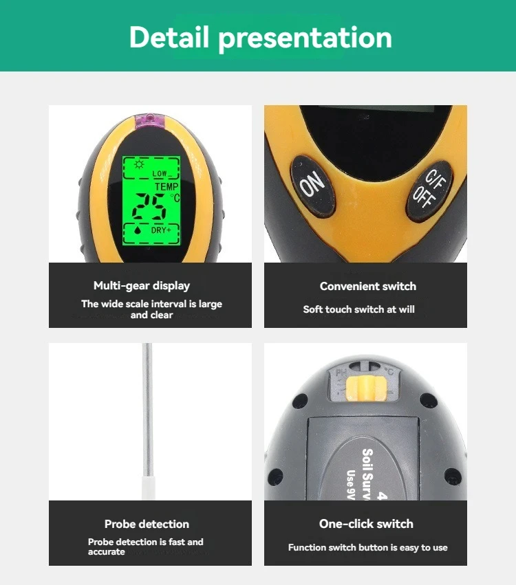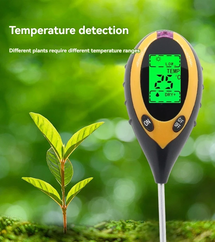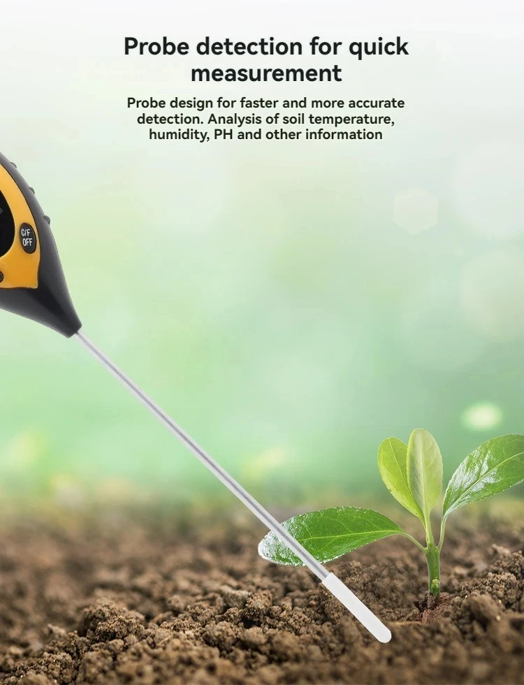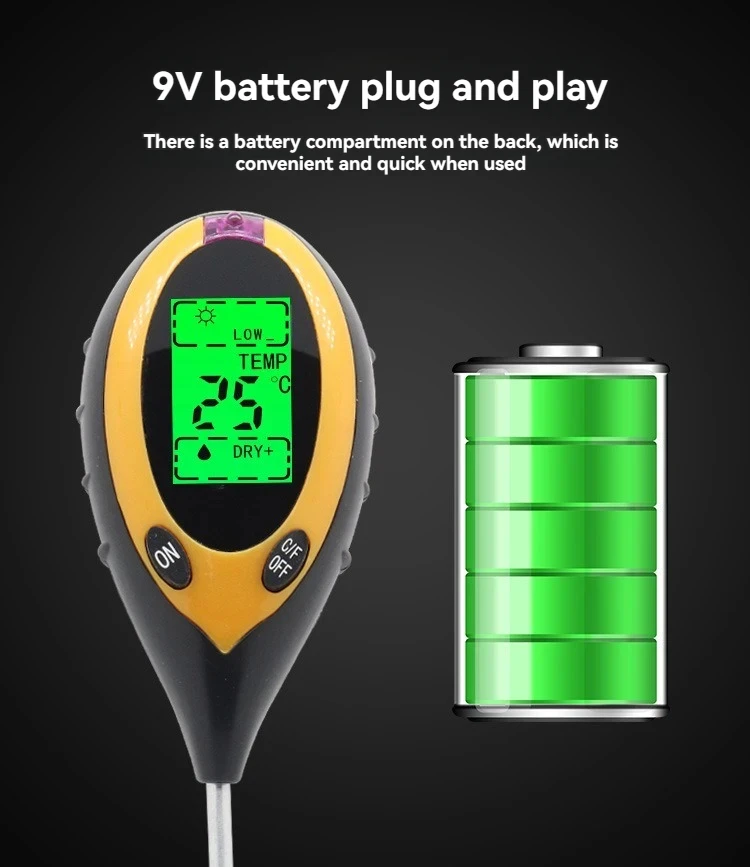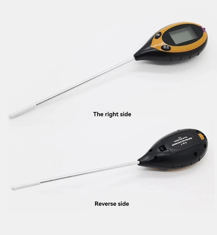 The four-in-one soil analyzer is mainly used to test soil ph, moisture and humidity, temperature and plant light intensity. It USES a 9V carbon battery with a simple operation and a probe length of 200mm.