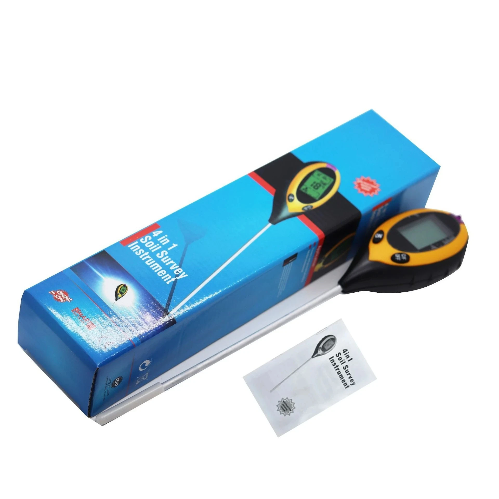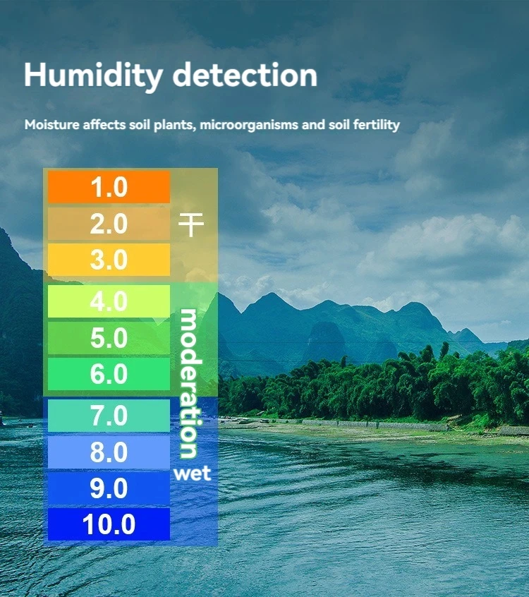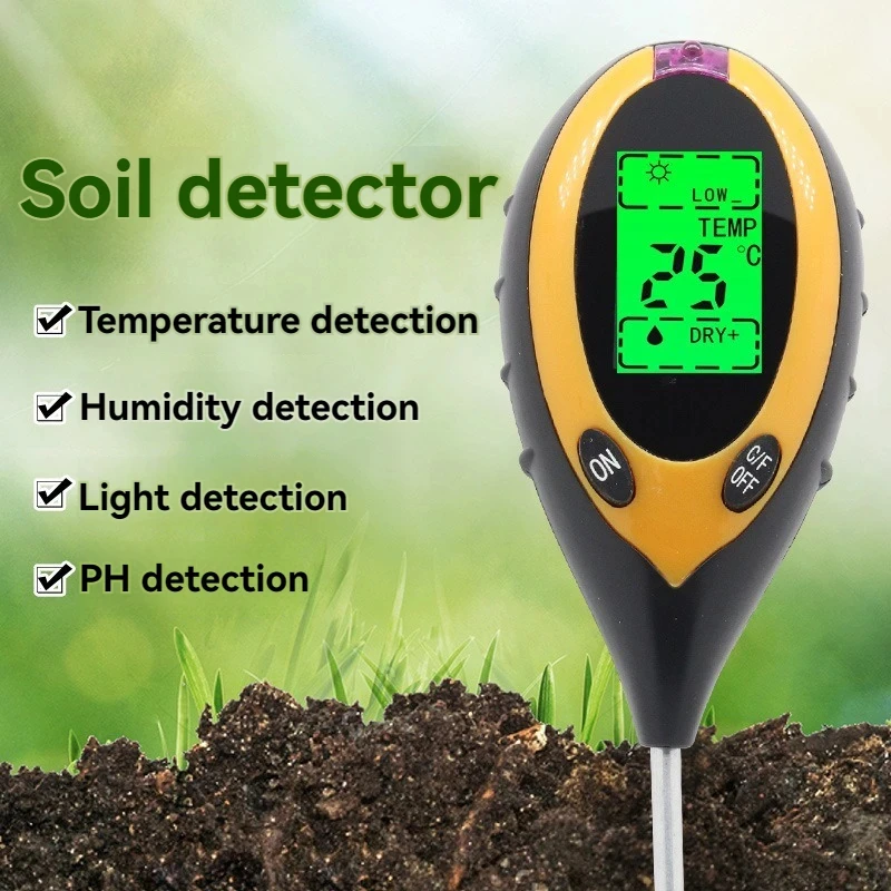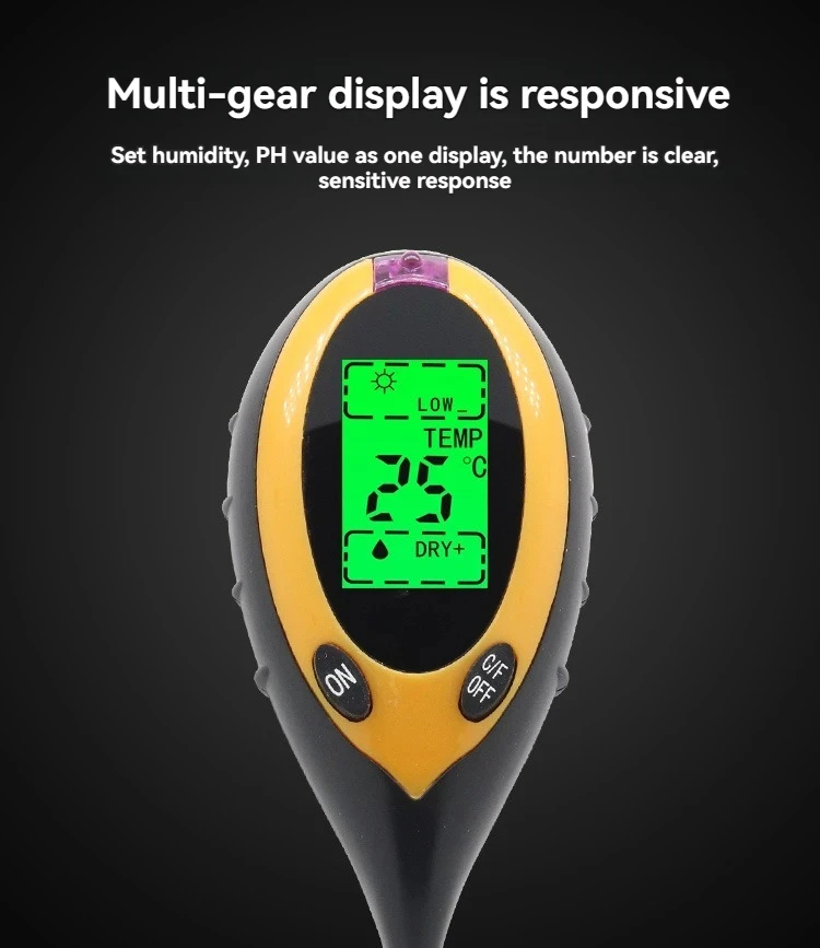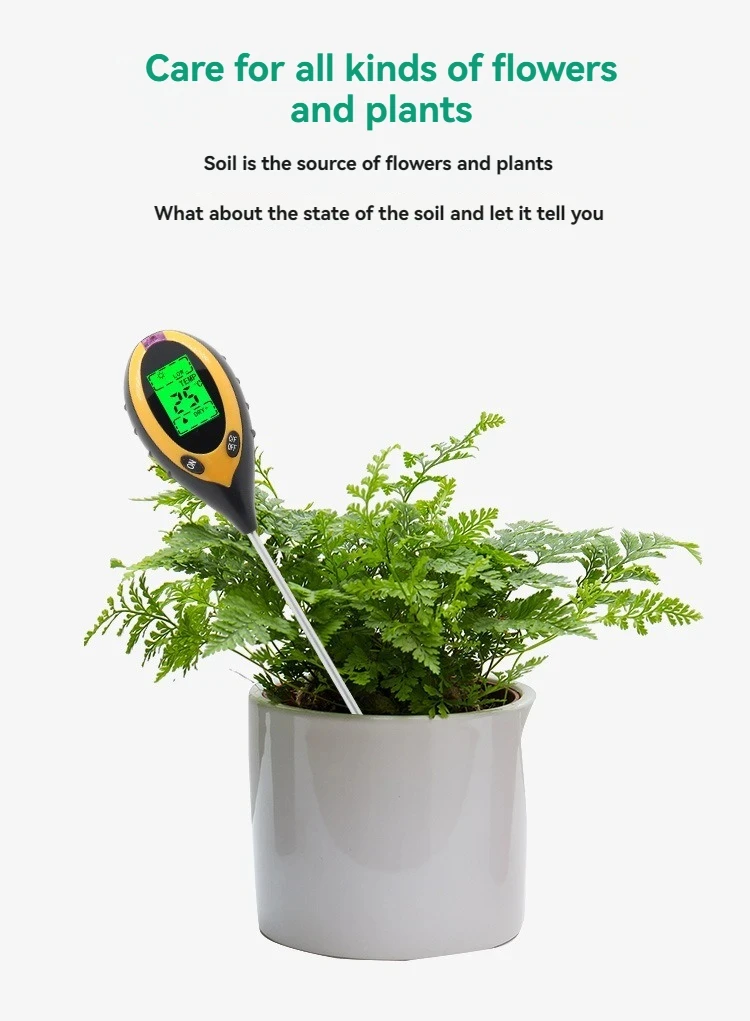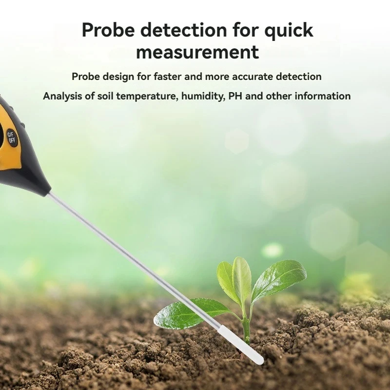 The four-in-one soil analyzer is mainly used to test soil ph, moisture and humidity, temperature and plant light intensity. It USES a 9V carbon battery with a simple operation and a probe length of 200mm.