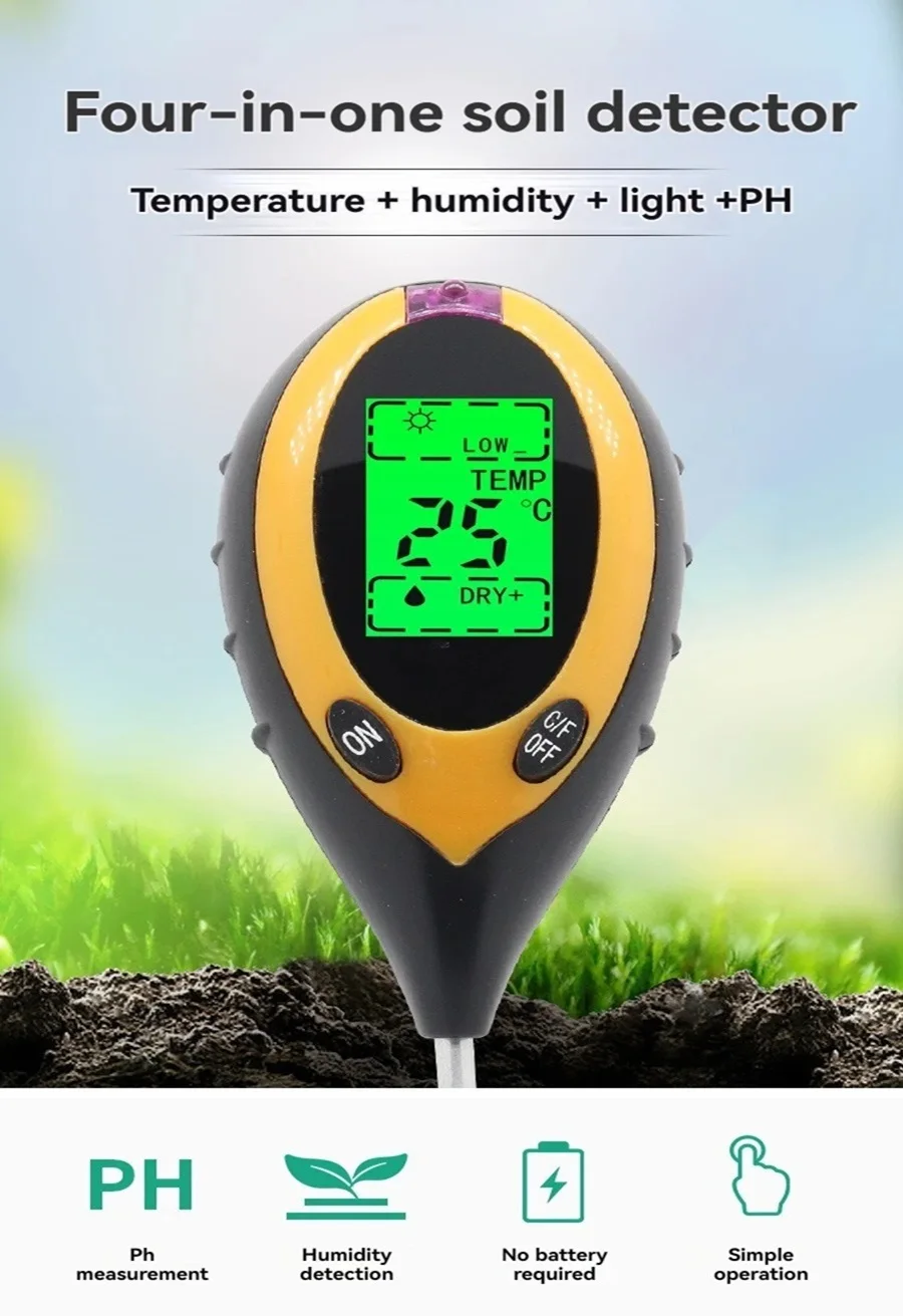 Soil PH Meter Tester Soil Tester PH Moisture meter Temperature Sunlight Intensity measurement Analysis Soil Acidity Test 4 in 1