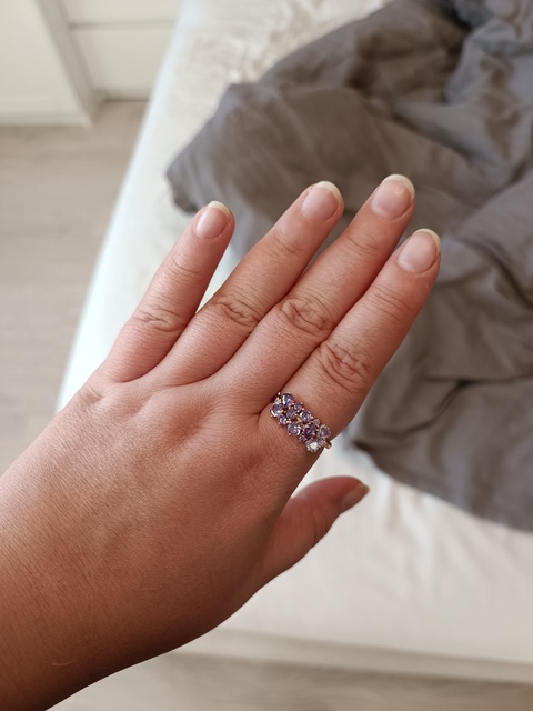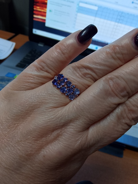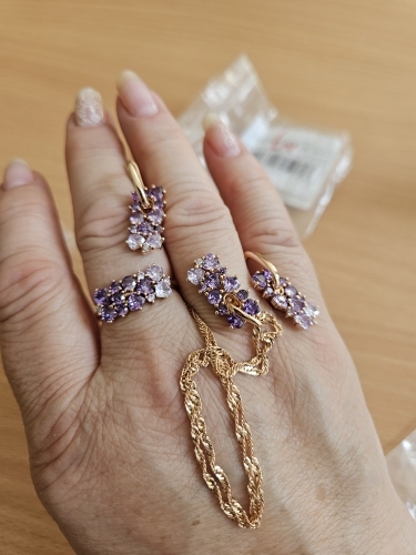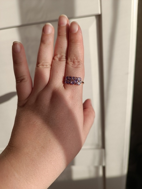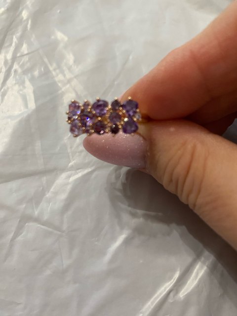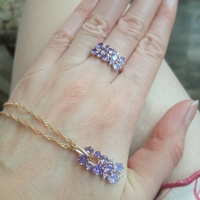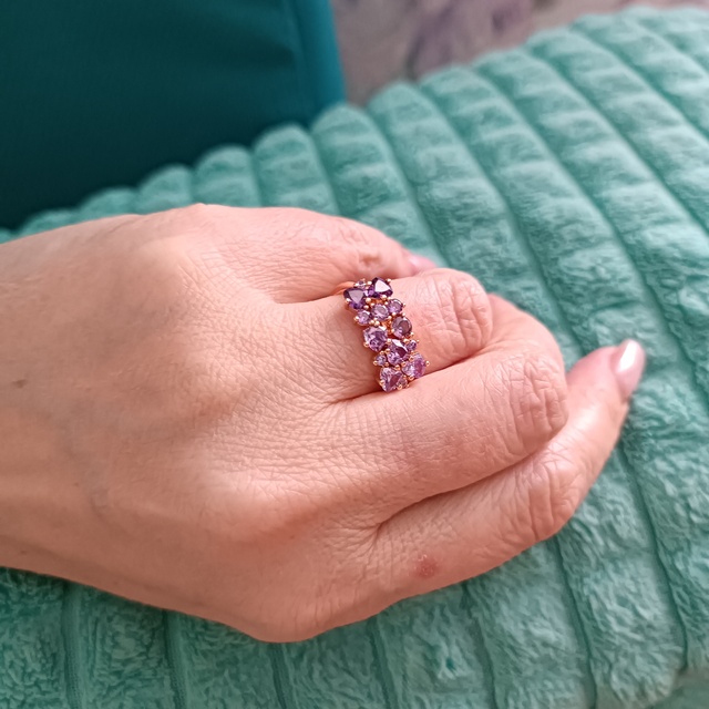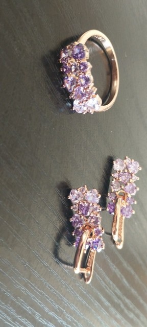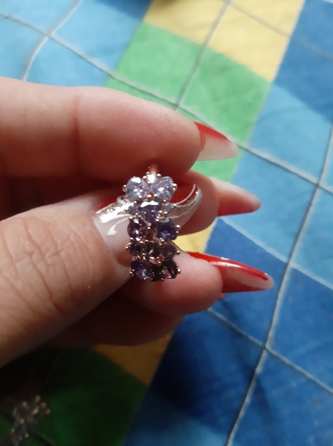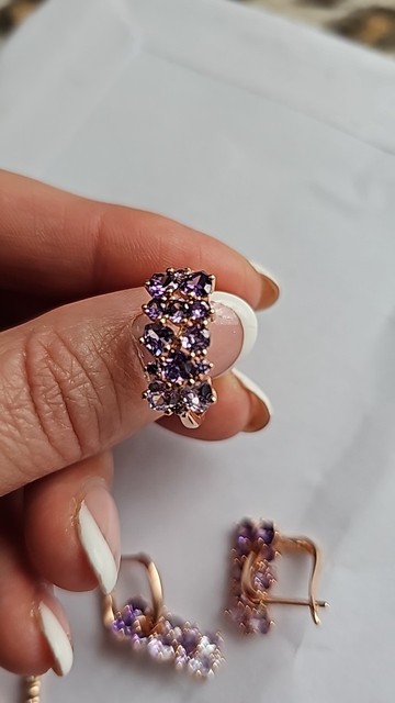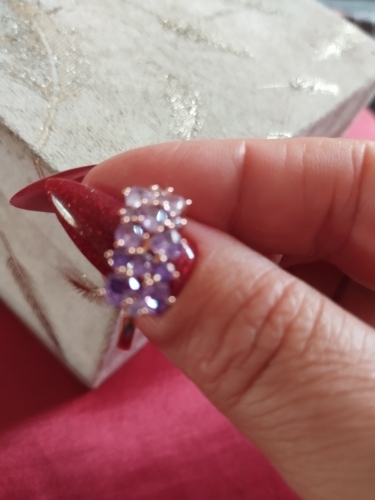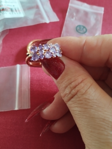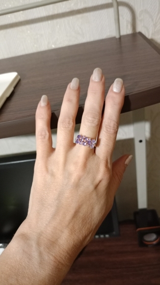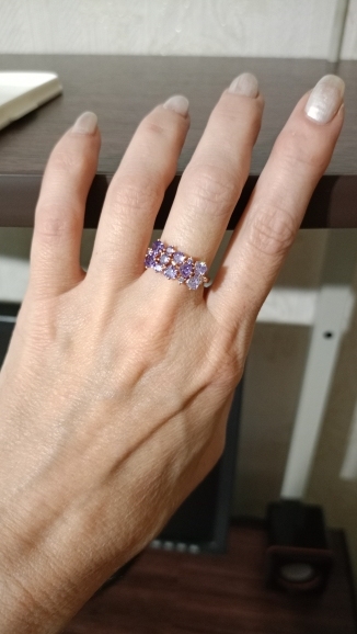 Incredible beauty ring! In the color of stones, it has a gradient: from light purple to dark. Glitters very brightly like diamonds (probably)☺. Very satisfied with the purchase. The size corresponds. For 20 Russian fit 10. assembled a set together with earrings and a pendant. Now one of your favorite sets!