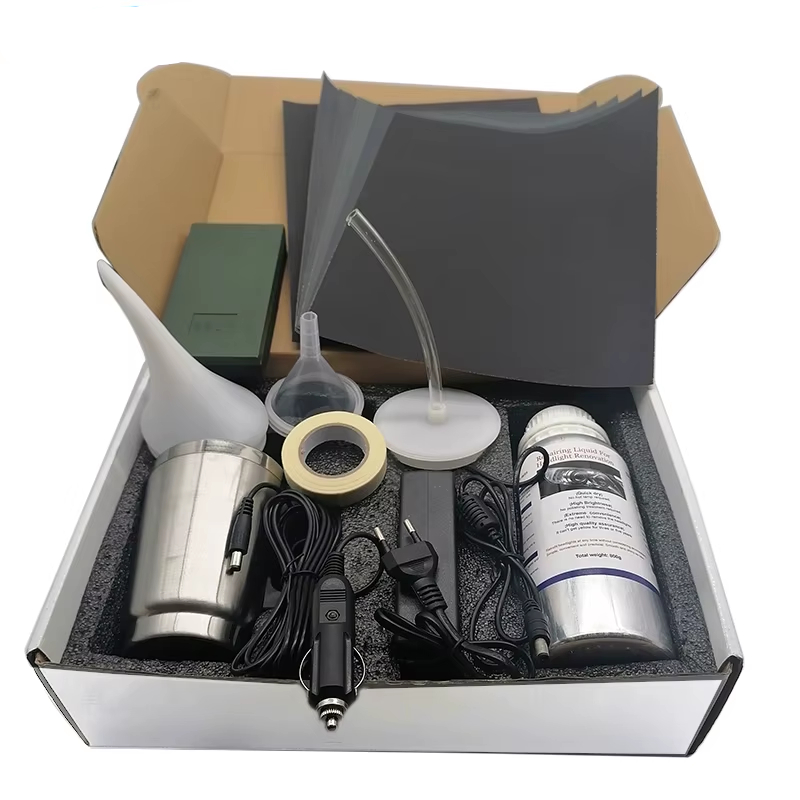 Package 1 is a toolbox headlight repair kit, the same as the picture. The package includes a power plug, a 3-meter car plug, 800G headlight repair fluid, a heated cup, 6 sheets of sandpaper, a textured paper, a funnel, a wiper, two cup lids, and two collars.