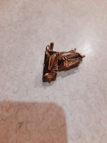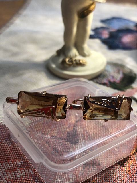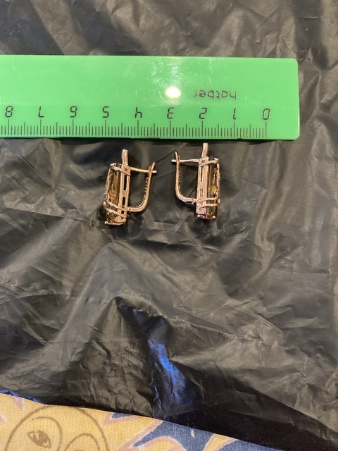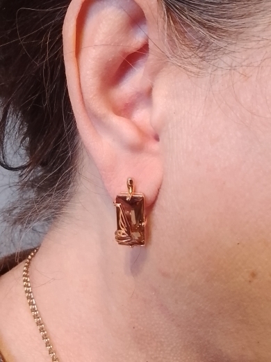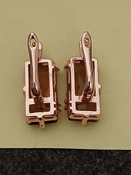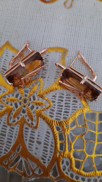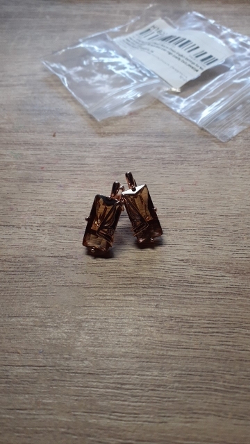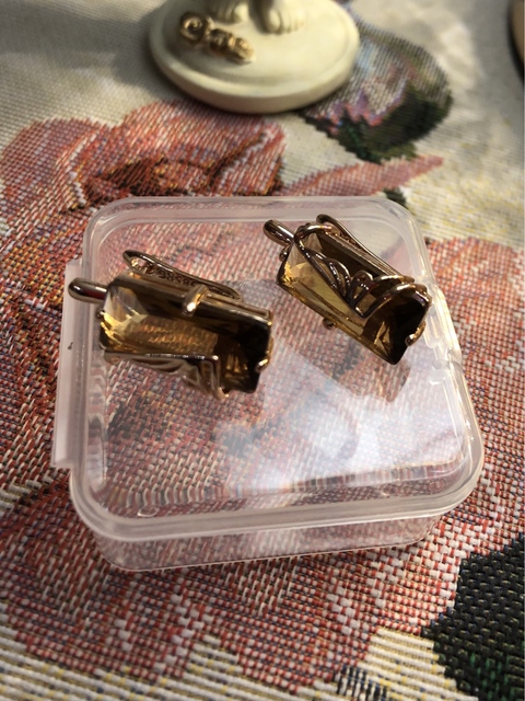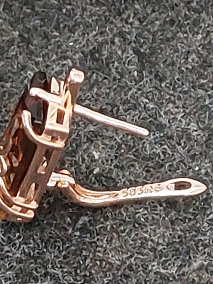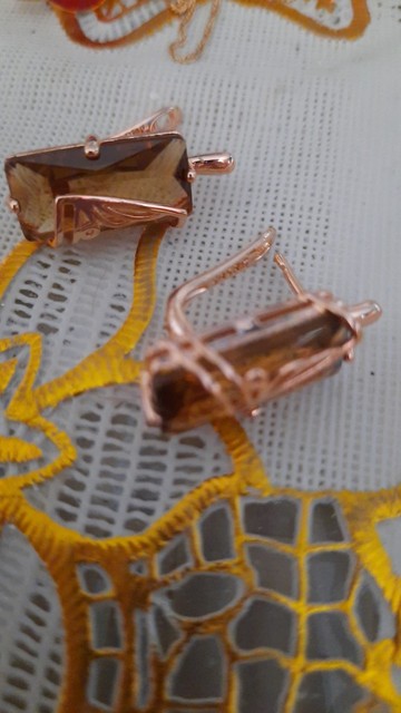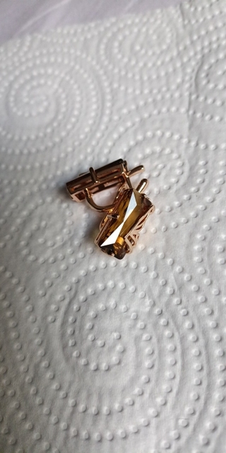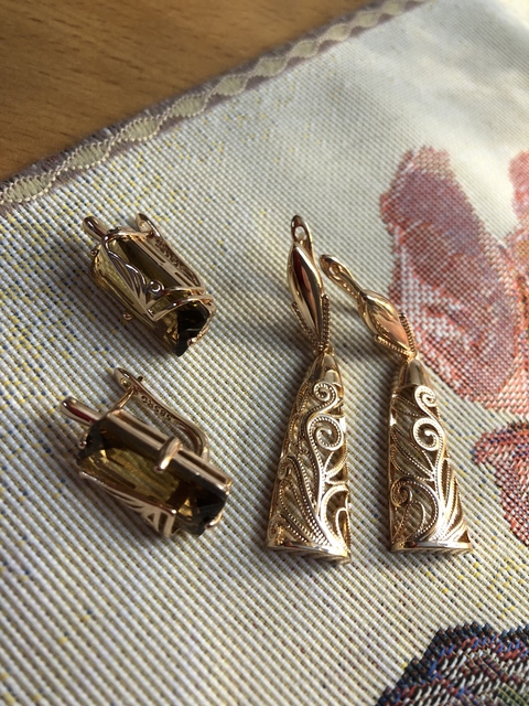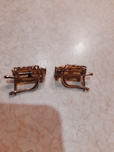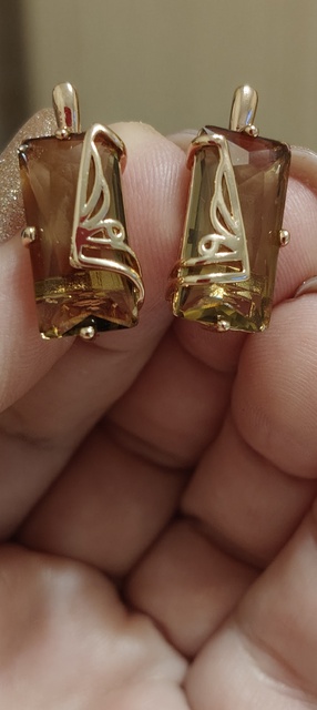 Very beautiful and original gold plated earrings. The gilding is not simple. There is a stigma 585 RG. Rolled Gold-this is the so-called “knurled” or “fused” gold. This technology differs from modern gilding, in which the gilding is only a few microns and such a coating with a thickness of tens to hundreds of microns is not erased and lasts for decades without damage. The Hinge of one earring is rivet poorly and dangles a little. The rods of the English locks had to be bent so as not to undone spontaneously. But again, the earrings are very beautiful.
