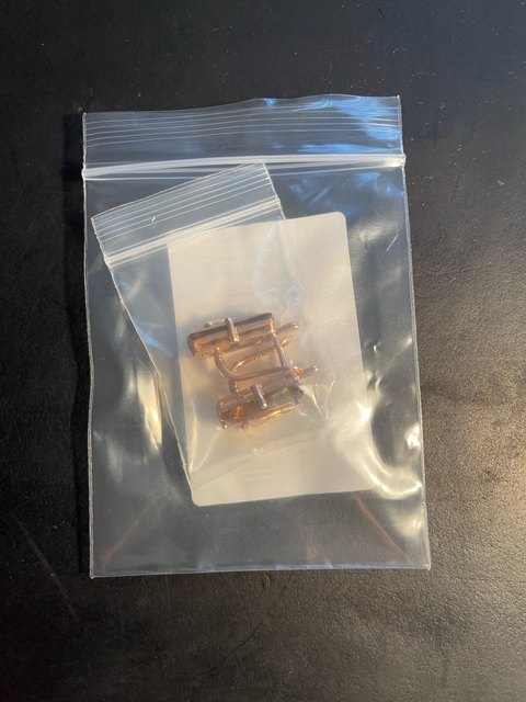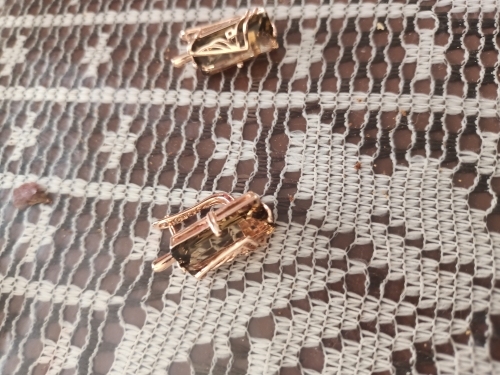 Очень красивые и оригинальные позолоченные серьги. Позолота не простая. Стоит клеймо 585 RG. rolled gold – это так называемое «накатанное» или «наплавленное» золото. Эта технология отличается от современного золочения, в котором позолота составляет всего несколько микрон и такое покрытие толщиной от десятков до сотен микрон не стирается и сохраняется без повреждения десятки лет. Шарнир одной серёжки заклёпан плохо и немного болтается. Стержни английских замочков пришлось подгибать, чтобы самопроизвольно не расстёгивались. Но, повторюсь, серьги очень красивые.