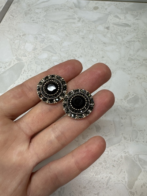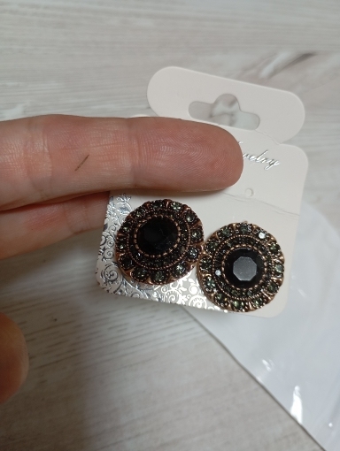 Серьги норм. Не сильно крупные. На ушке сидят хорошо. Подкачал цантральный камень, он из пластика. Камни вокруг красивые, похожи на марказиты. Брала в комплект к кольцу.