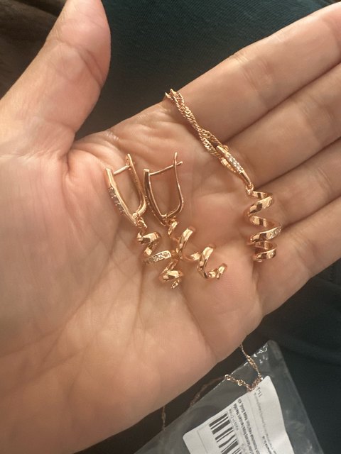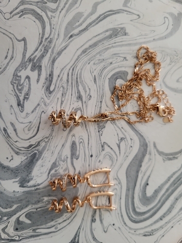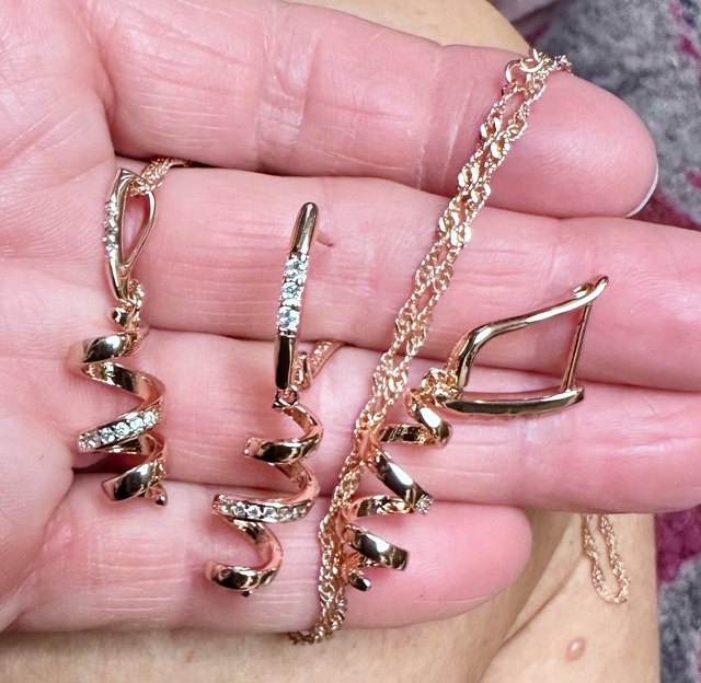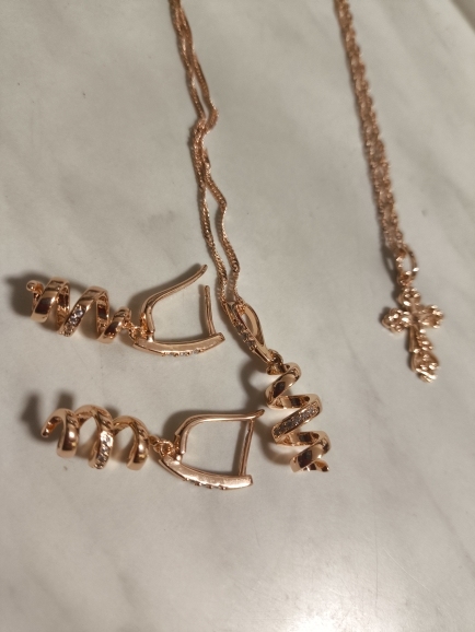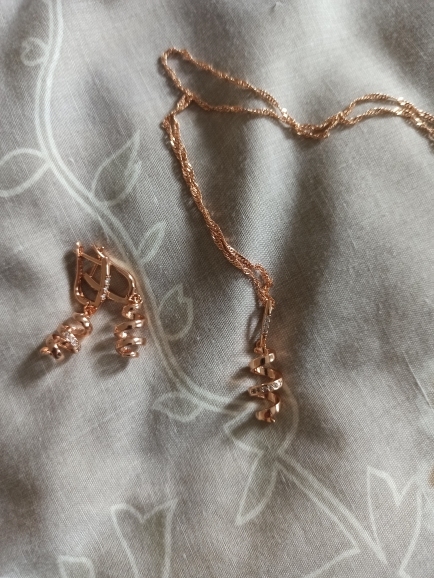 Прекрасний, ніжний набір прикрас. Як справжнє золото, задоволена, що маю таку річ, рекомендую. Хто сумнівається можете сміло замовляти, дуже гарний набір прикрас.