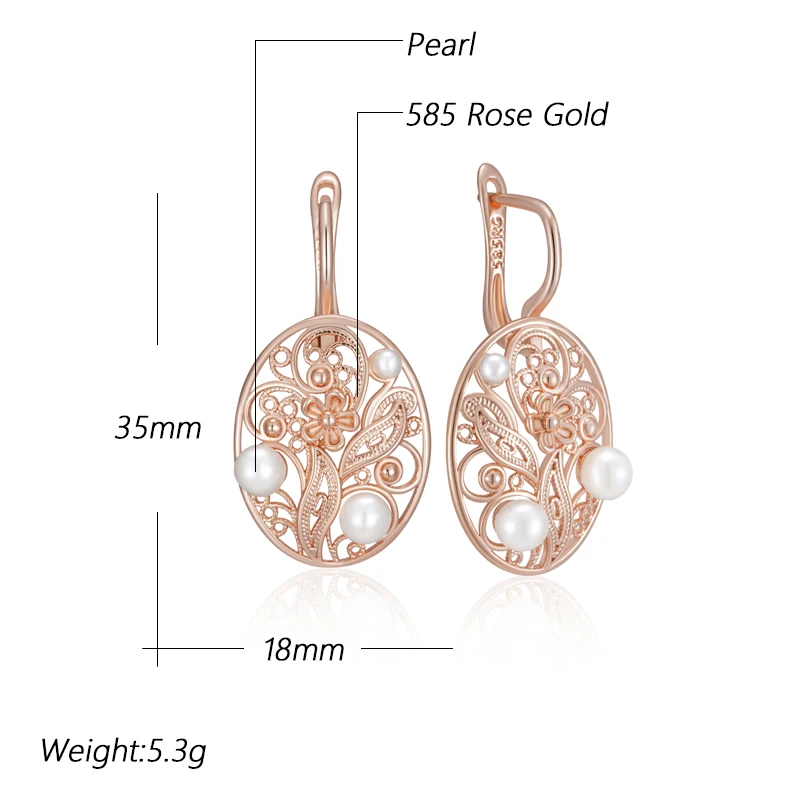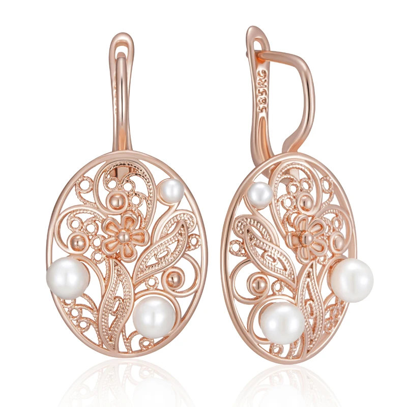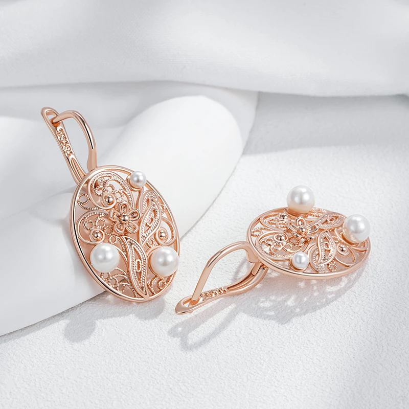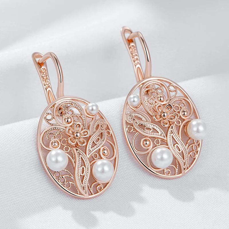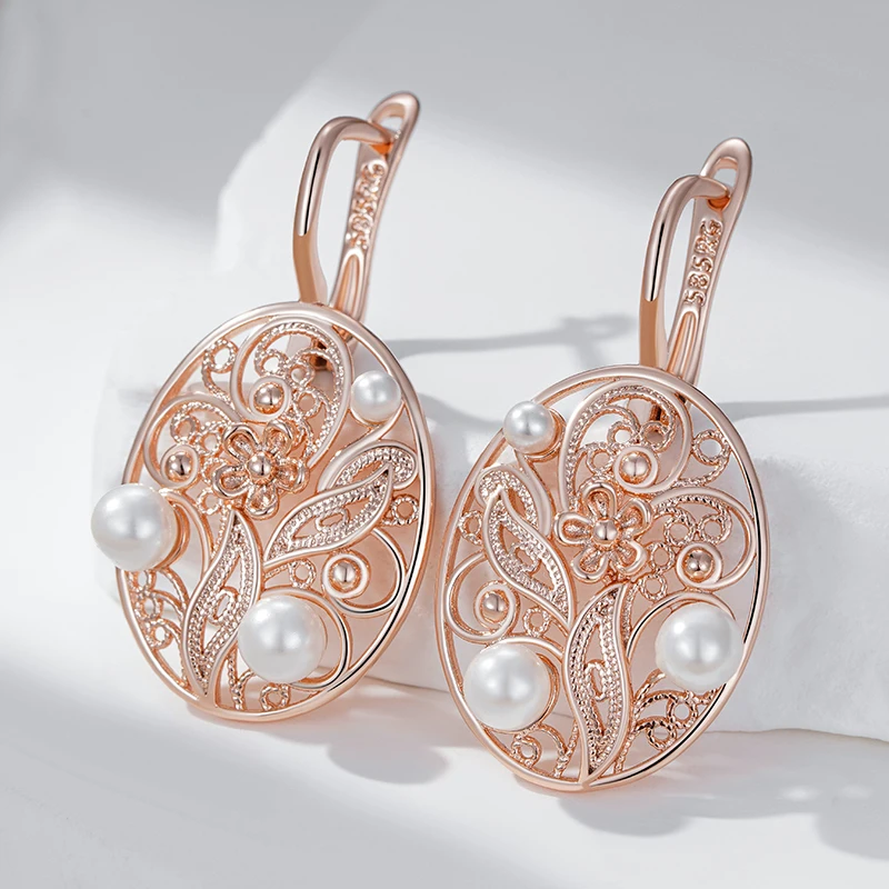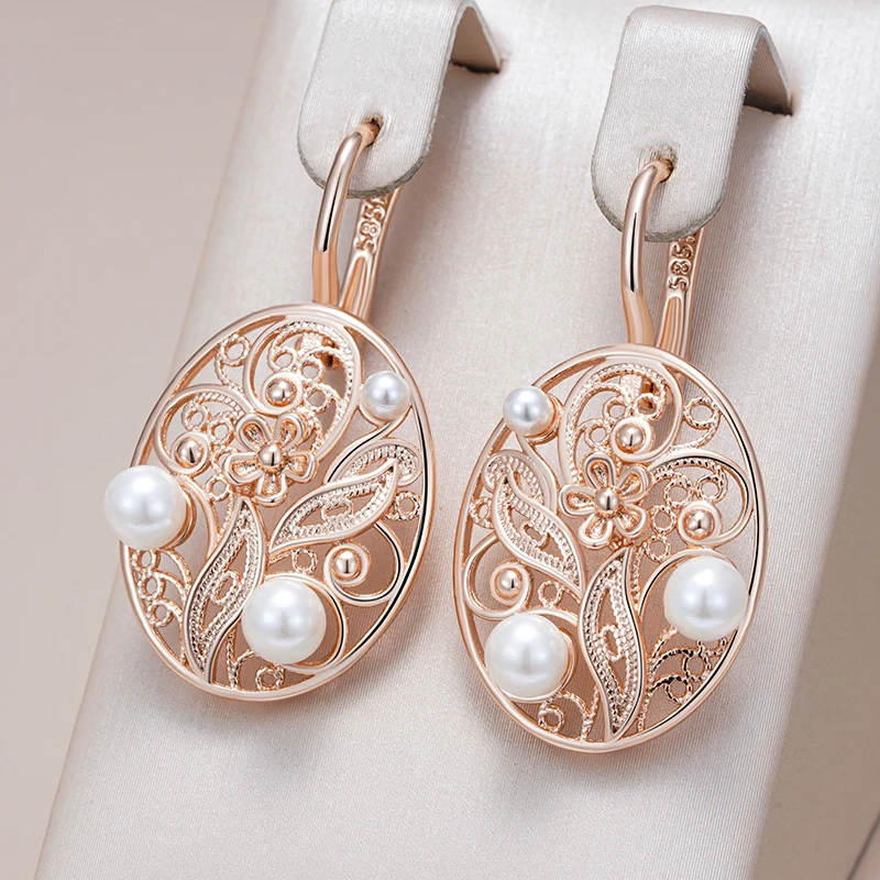 Kienl Hot 585 Rose Gold Color Pearl Dangle Earrings for Women Trend Glossy Metal Flower Accessories Vintage Daily Fine Jewelry