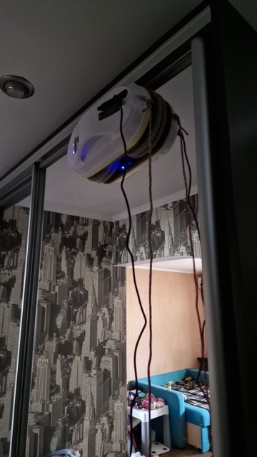 Ползает, моет, все хорошо! Шум от работы двигателя присутствует, уснуть не удастся! Если какое препятствие движению, например шнур питания застрял, робот издаёт сигнал. После установки на стекло необходимо нажать на пульте в какую сторону двигаться, после одного прохода робот останавливается, нужно нажать новое движение или снять со стекла.