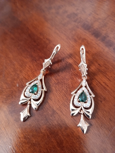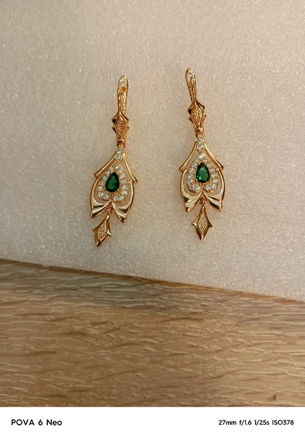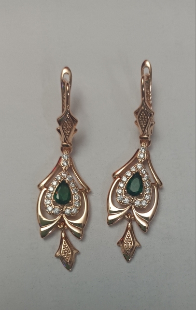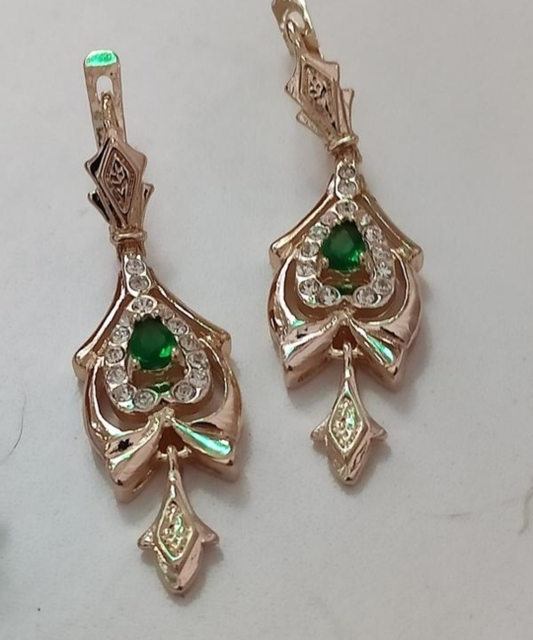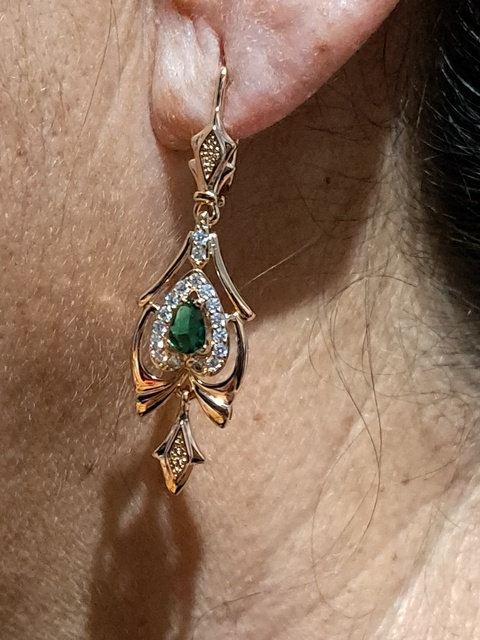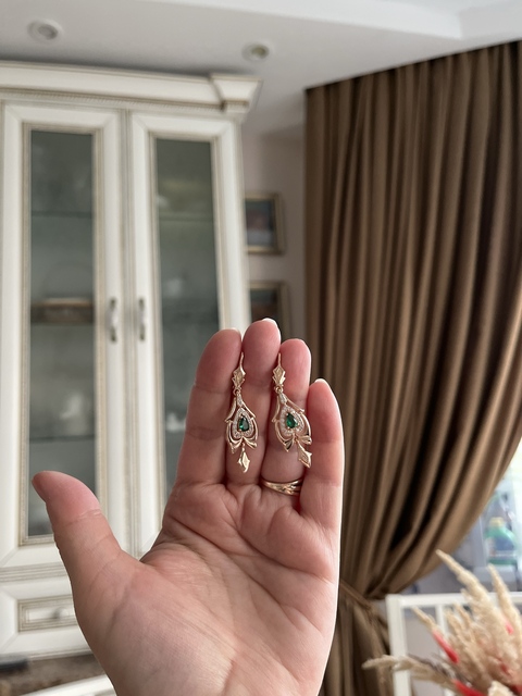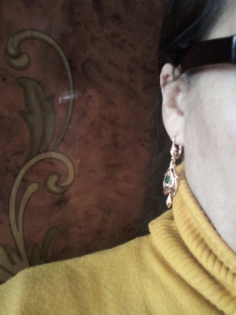 Interesting not small earrings with a green stone, suitable for older women, good performance, under the Soviet Gold, English clasp.