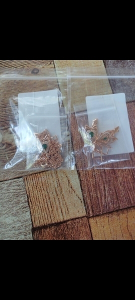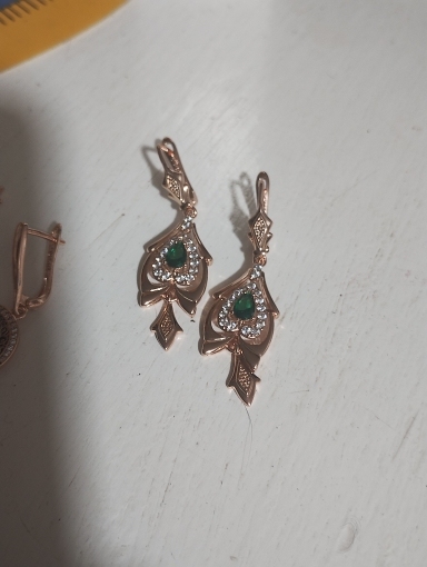 Nice earrings, looking noble, very good size, green pebble shimmering on daylight, gold is reddish on daylight, more orange and yellow than on the photos. Delivery OK.