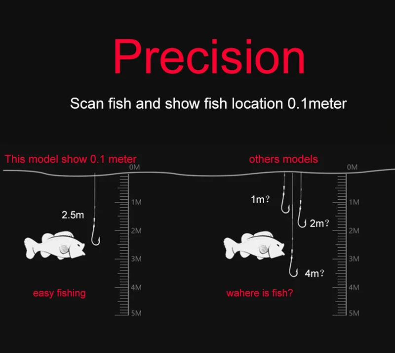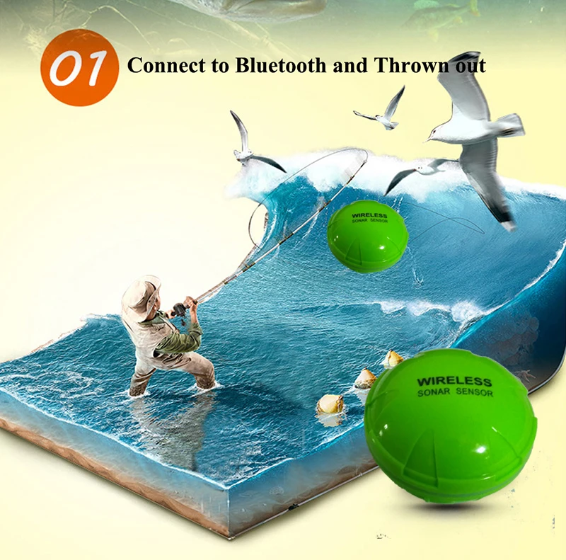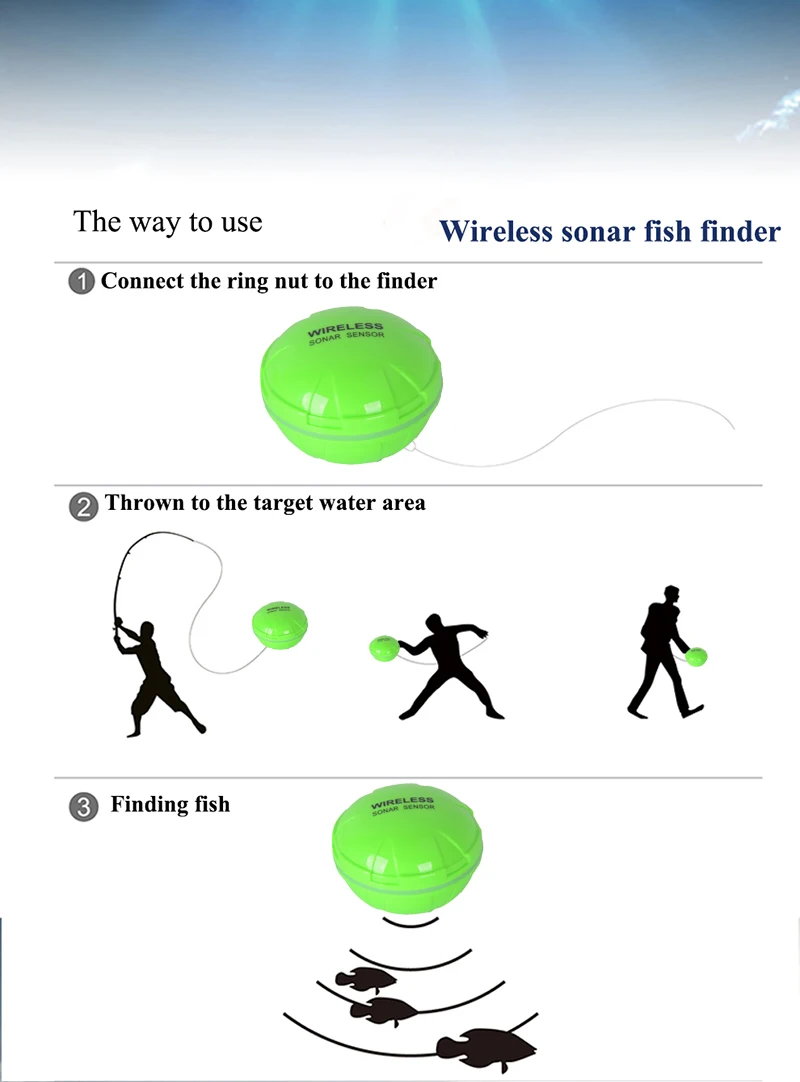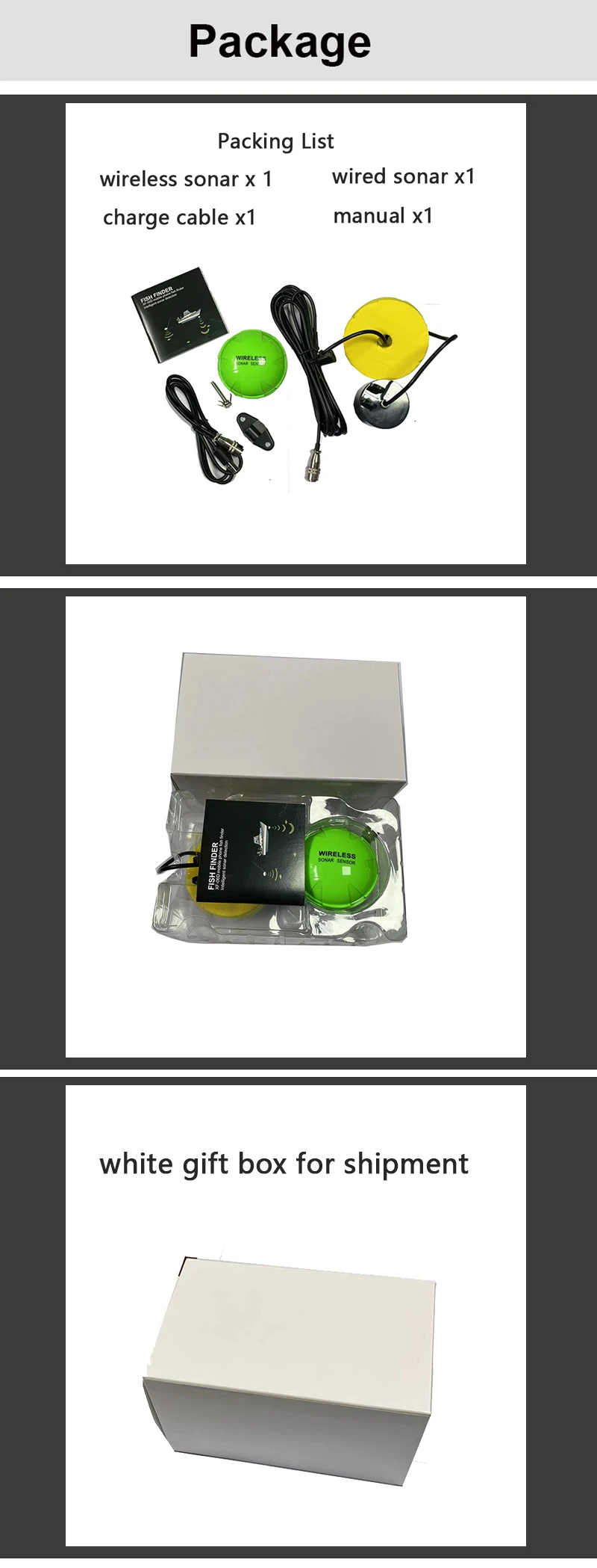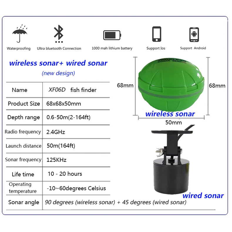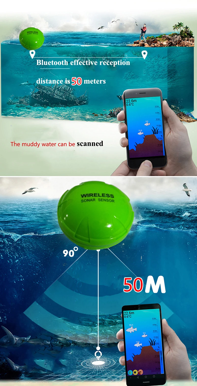 for the user to select, sonar frequency is 125KHz, depth up to 164ft / 50m, with rechargeable 3.7V lithium-ion battery, the using time is up to 10-20 hours.