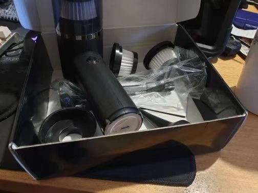 Fast delivery. Light weight portable hoover. Fairly powerful, good number of attachments, spare filters and a wee box for storage. Charged quickly. Ill wait and see how long the charge lasts.
